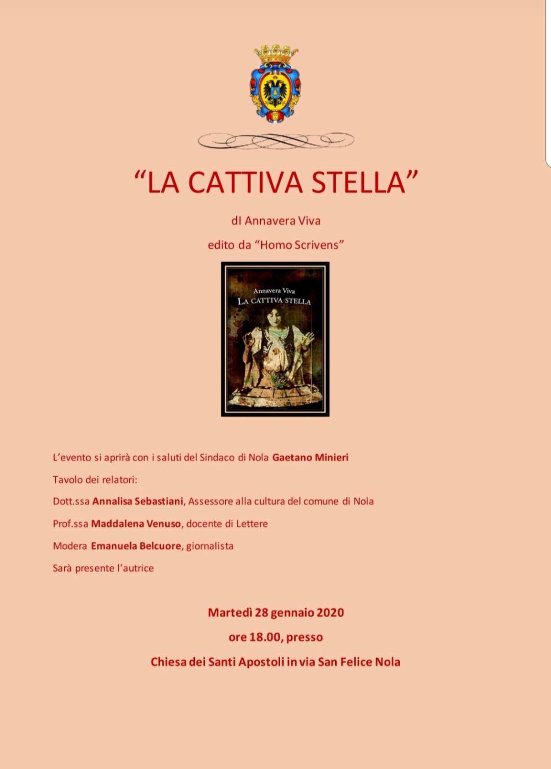 La cattiva stella di Annavera Viva, edito Homo Scrivens, sarà presentata a Nola il 28 gennaio, ore 18, presso la chiesa dei santi apostoli. L’evento si aprirà con i saluti del primo cittadino Gaetano Minieri. Dopo Questioni di Sangue e Chimere percorriamo un viaggio tra le viscere di Napoli dove magia e superstizione si confondono con la fede; sacro e profano in un unico romanzo. Un delitto, quello a cui ancora una volta devono venire a capo i protagonisti. I profumi, le ricette culinarie napoletane e tanto altro in un libro da leggere tutto ad un fiato. Al tavolo relatori Annalisa Sebastiani, assessore alla cultura del comune nolano.e Maddalena Venuso, docente di lettere. Modera la giornalista Emanuela Belcuore. Sarà presente l’autrice.